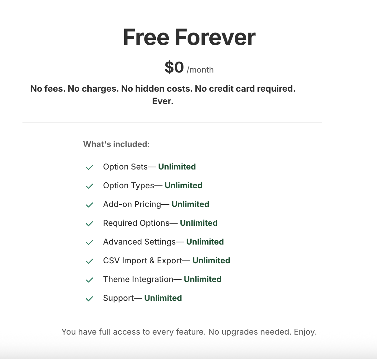 Product options are essential functionality, not a luxury. You shouldn't have to pay monthly fees just to let customers enter their name for engraving or select a delivery date.